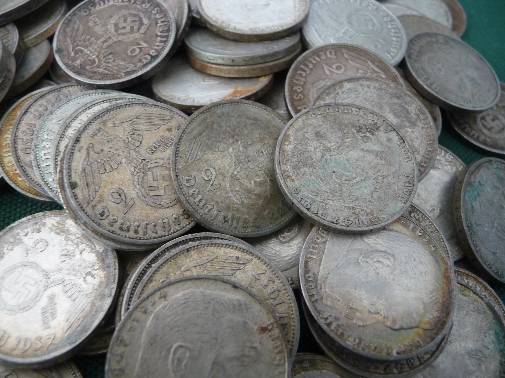 100 x Nazi 2 Reichsmark Silver Bullion Coins! 1/2 Kilo of Fine Silver These "swastika" Nazi coins are all in poor collector condition but guaranteed as Third Reich Coins to each contain 5g of fine silver. 2 RM BULLION Email us on luke@luckylukeonline.com for availability and current best price!